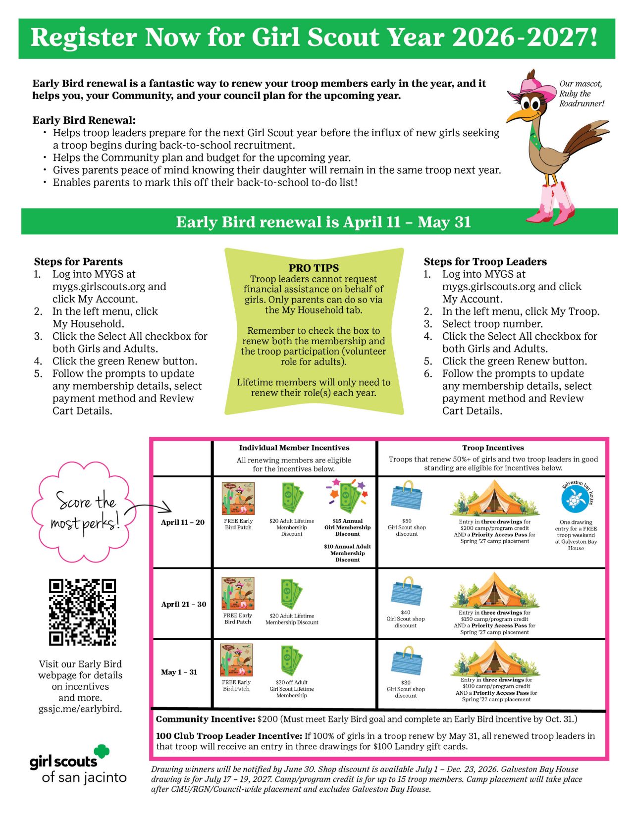When girls renew early, troop leaders will know if girls plan to return when school resumes in the fall and whether there are openings in the troop. Early Bird renewal: